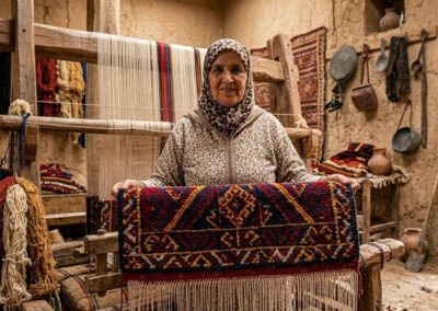 Next, you will begin the hands-on weaving process using a traditional loom. Under the guidance of your instructor, you’ll learn how to set the threads, create basic patterns, and weave your own small carpet or textile piece. This step-by-step process allows you to fully engage with the craft, understand the rhythm of weaving, and appreciate the patience and skill required to create Moroccan carpets.